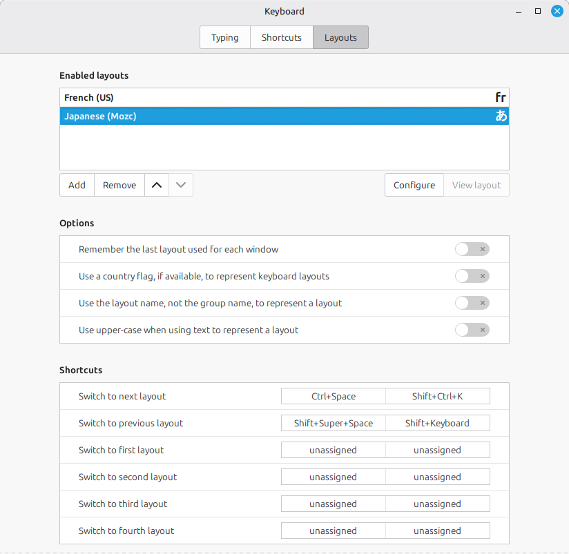 In this screenshot you can see a list of two layouts. One is a traditional XKB layout: French accents on a US ANSI layout. The other is actually an IBus input method: Japanese, using the Mozc engine.